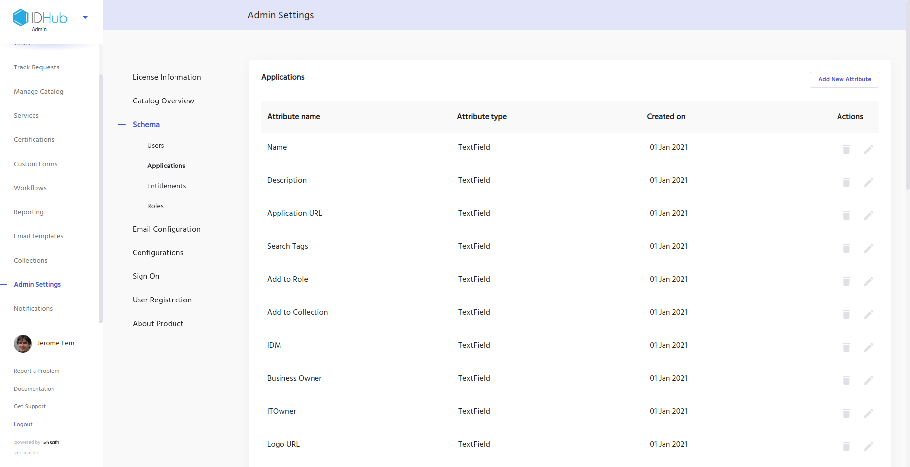To edit the application and entitlement schema, first login to your tenant as an admin. Then Click on Admin settings. After that click on Applications under schema, to edit the application schema. You will see a page as shown in the screenshot below: