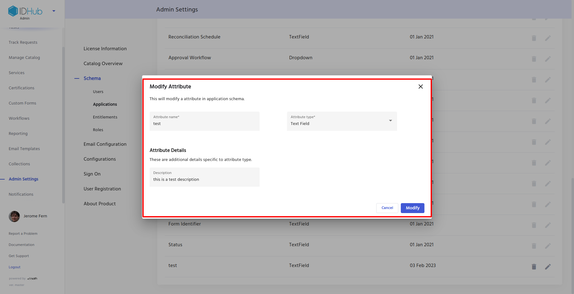 - Here you can modify the attribute name, type and description and click on modify button to edit that attribute.