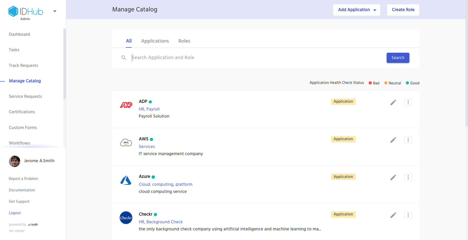 The first step of editing the application entitlement is go to the Manage Catalog section of IDHub. Click on the Manage Catalog link in the left menu (Or you can also click on the Manage catalog link in the IDHub dashboard), then the following page would be displayed:
