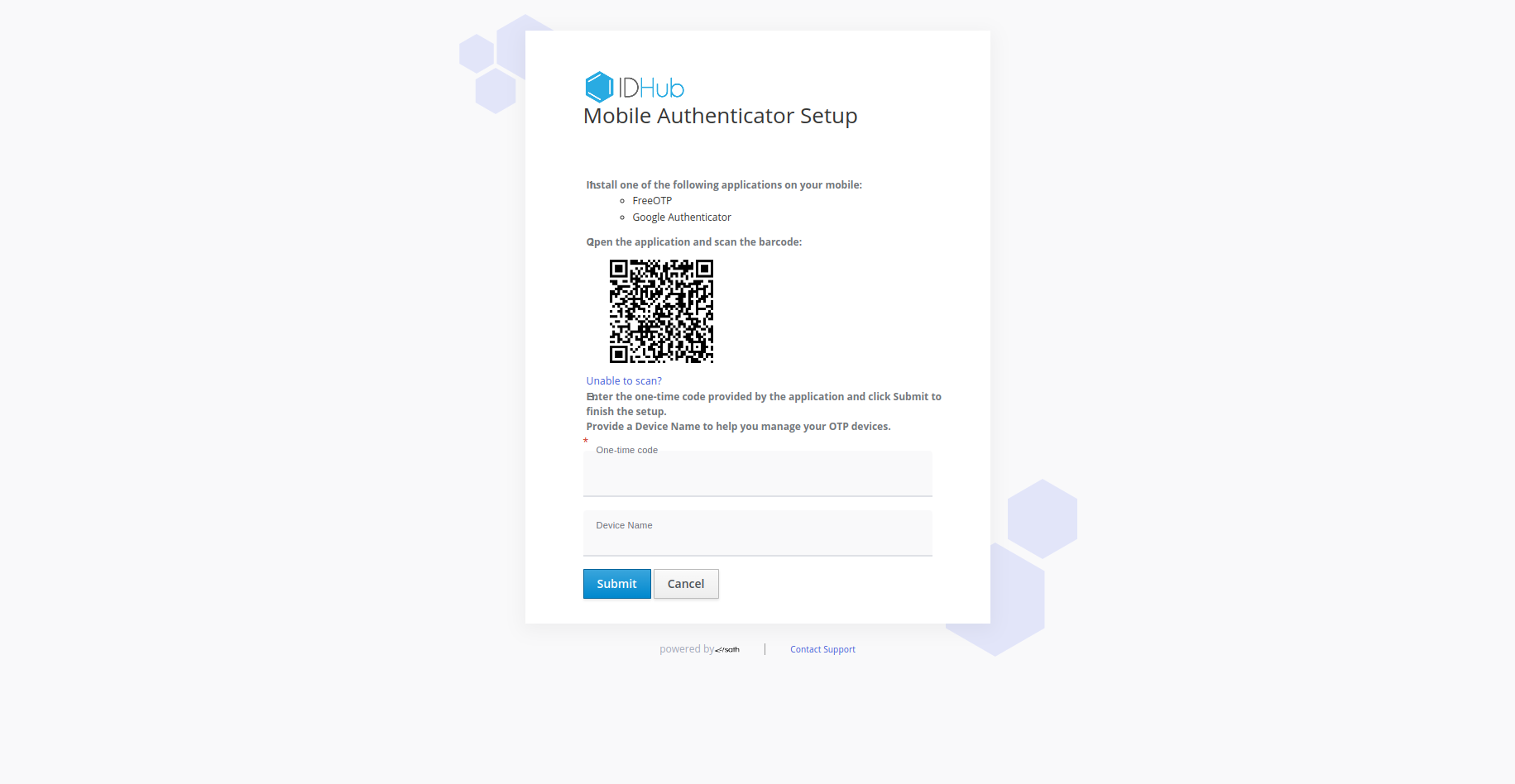 • After that, you will be shown the following page. Here you can use any Free authenticator app such as: Google Authenticator or FreeOTP to scan the bar code provided in the page.