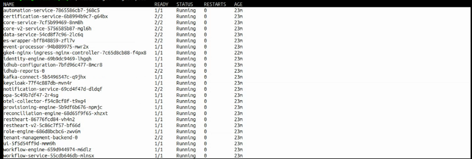 The status for all the pods must be in running state, which means that IDHub has been installed successfully on your k8 cluster.