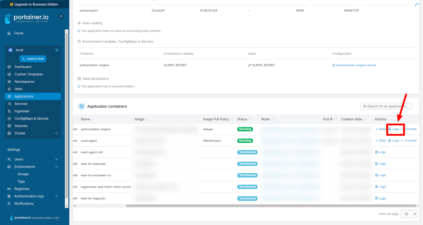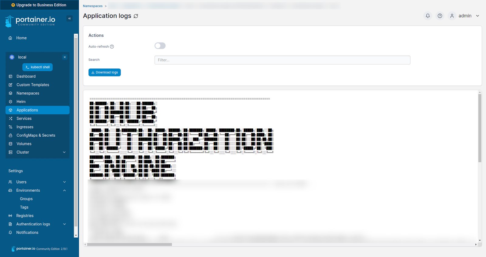 Portainer Manage Logs page
