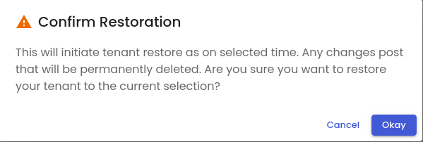 - A confirmation dialog box would open, to make sure that you would really like to restore the tenant data from the backup.