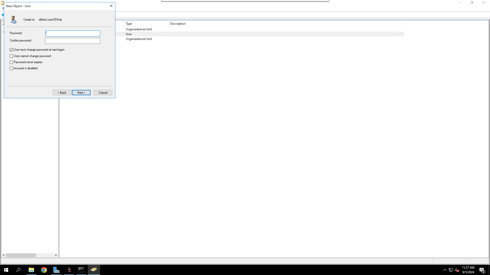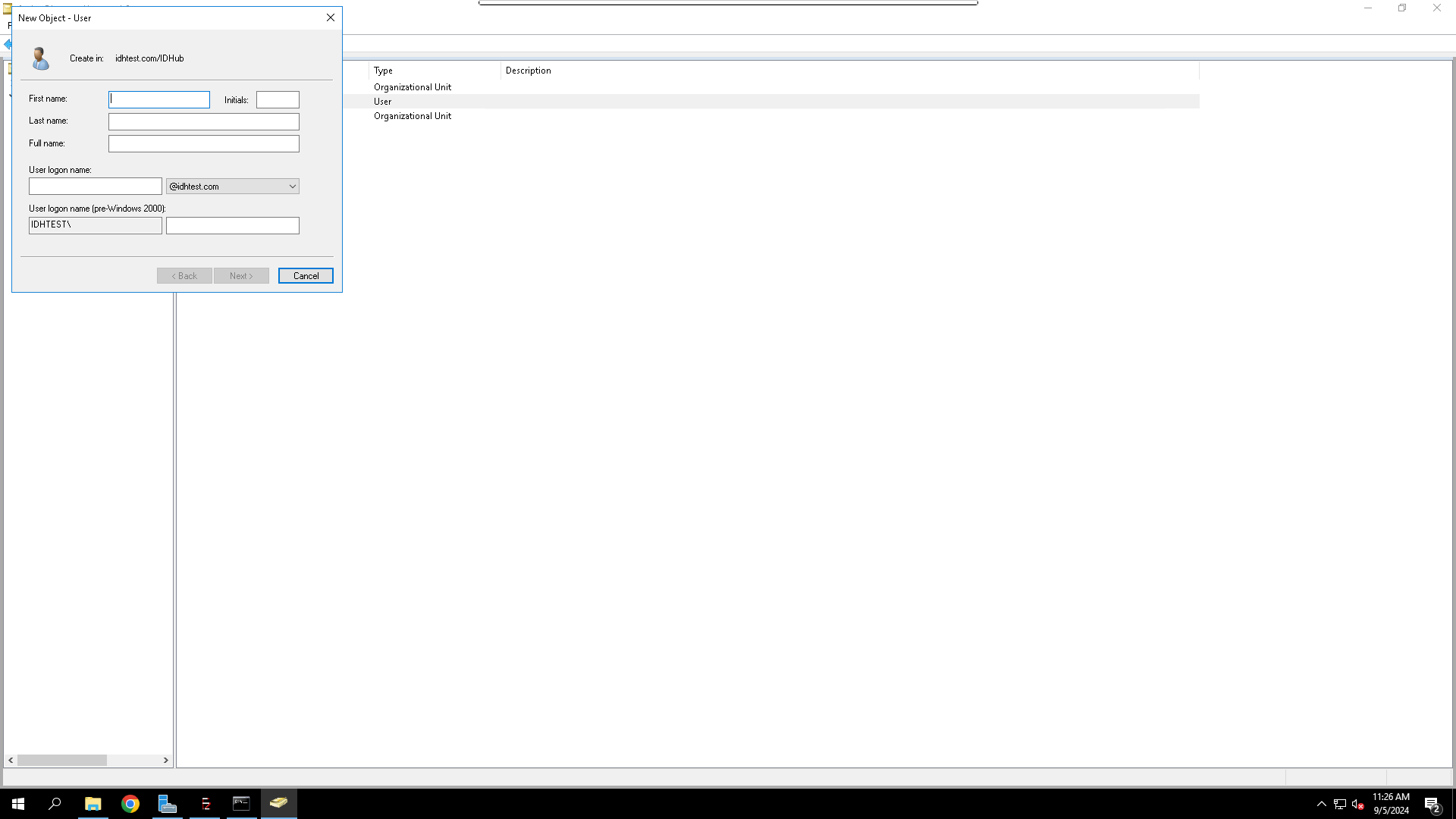 First Name,Last Name(optional), andUser Logon Namefields. For a service account, it’s common to use a naming convention likesvc_idhubor similar for easy identification.