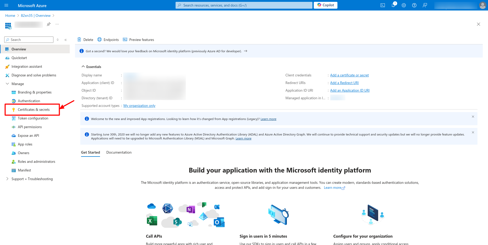3. Next, Click on Manage and then Click on Certificates & secrets