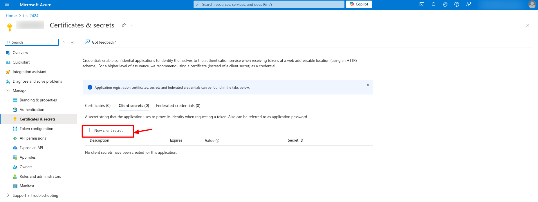 4. Go to Client Secrets section and Click on + New client secret to add a new client secret