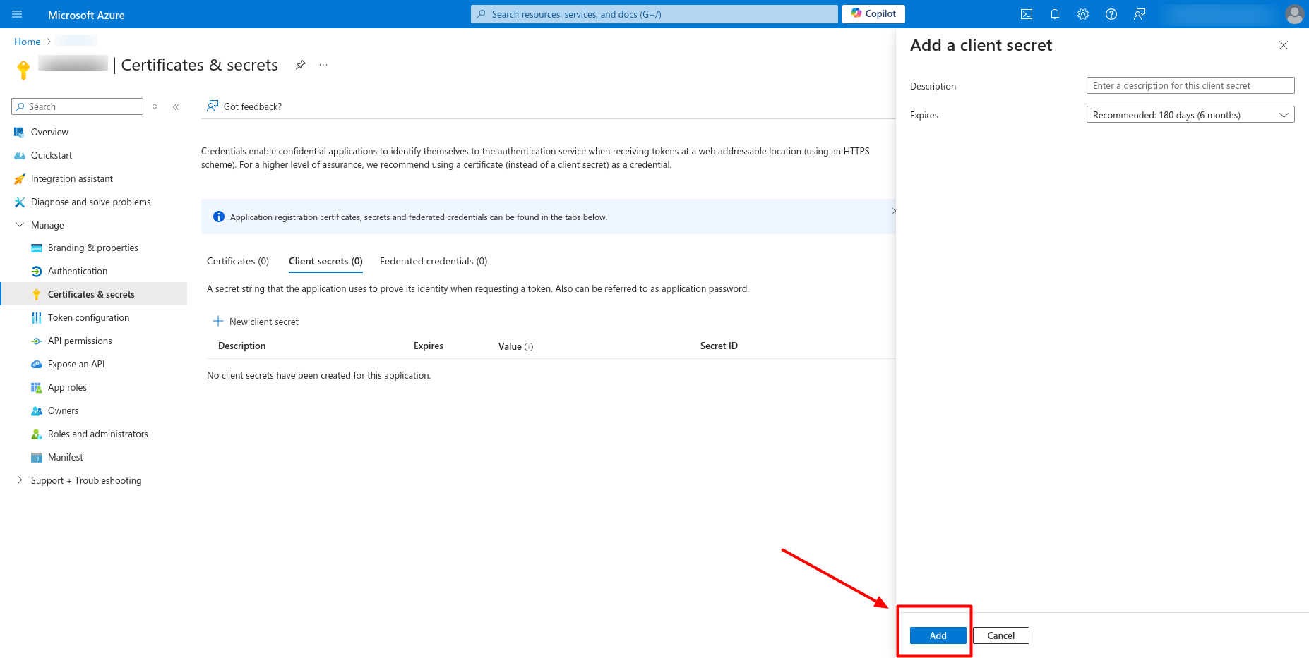 5. To add new client secret, add secret description and expiry and then click on Add button in the bottom of the page