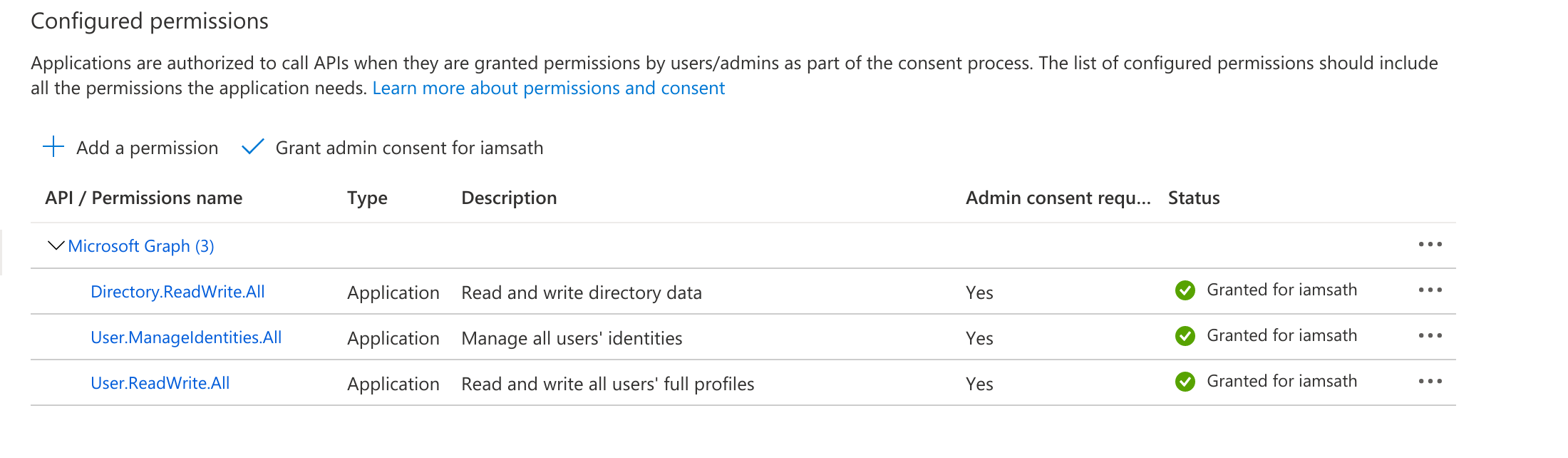 1. After adding all the permissions, the Status initially shows as Not granted. Click on “Grant admin consent for..”