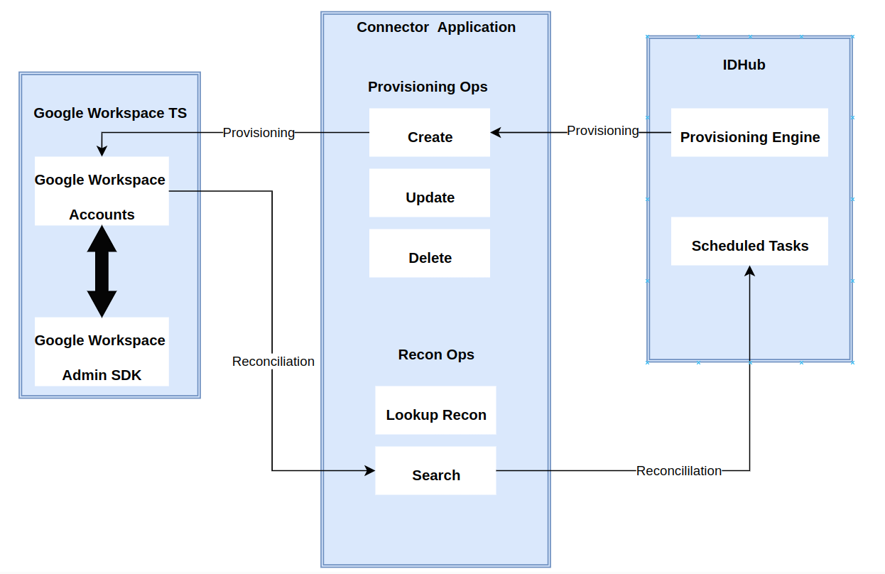 The connector's architecture is constructed in accordance with the diagram below: The connector architecture primarily consists of a connector application, google workspace SDK controller and a target system component. The native communication with the target system is handled by the target system by leveraging the implementation of the Google Specific connection. This architecture is implemented because it allows for rapid and straightforward connector deployment as well as precise versioning capabilities.