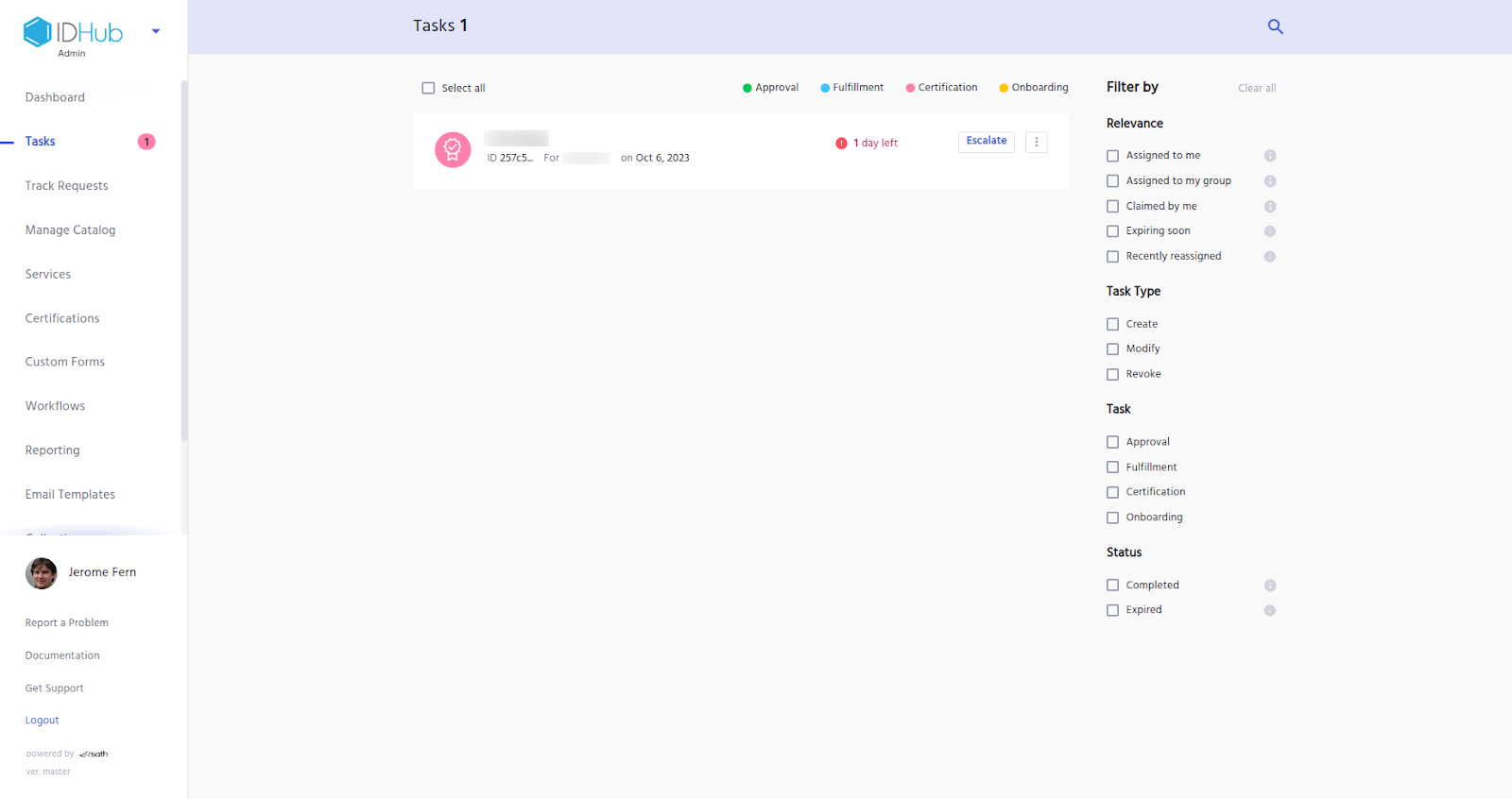 Once the certificate is run successfully, a certificate task would be generated for the certifier. The certifier needs to click on the Tasks (left menu) under the IDHub admin app. The certificate task would be displayed in the page (as shown in the screenshot below).