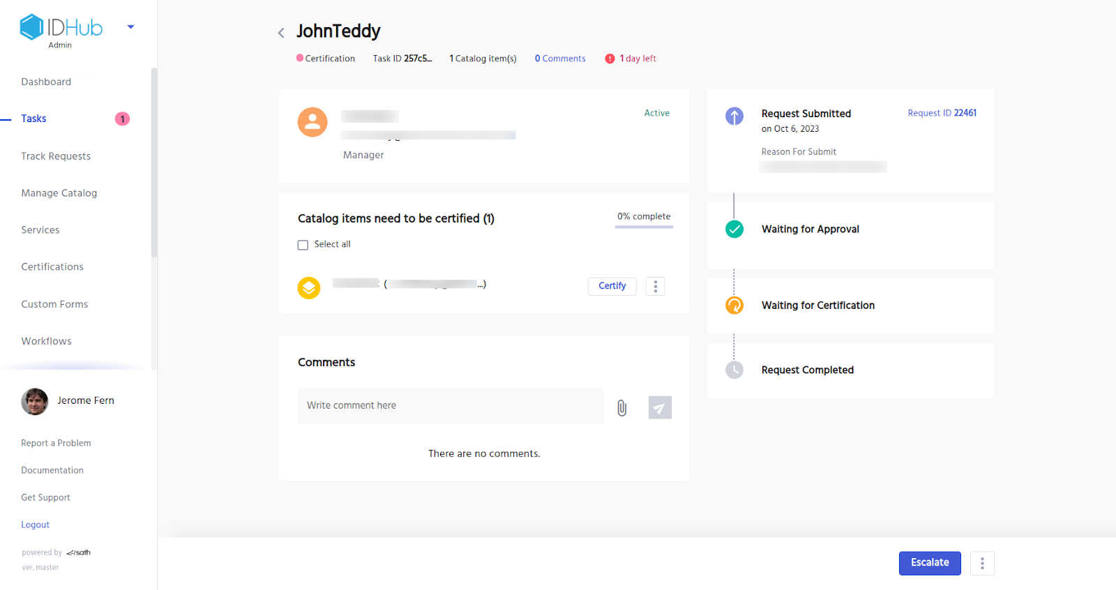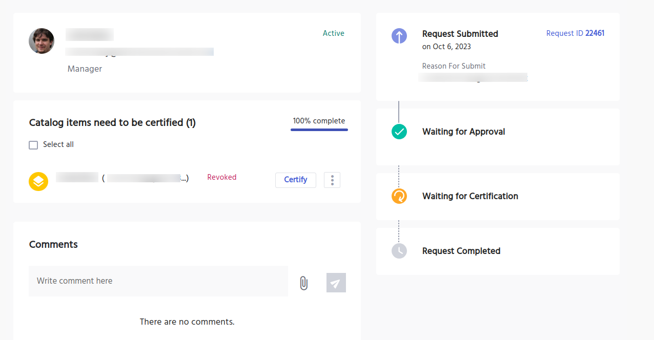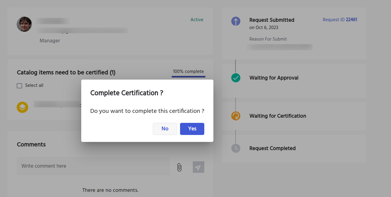 If you (the certifier) would like to certify the catalog items in the task. Then in that case, click on the certify button. Enter a reason for the same. Then click on the certify button.
