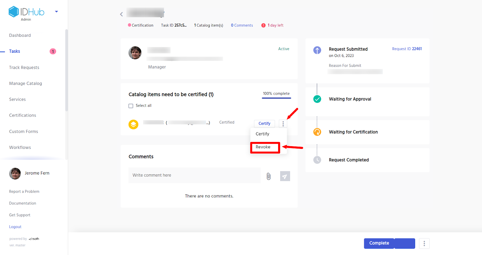 Again click on the revoke button (enter a reason for the revocation). As is shown below, the item would be revoked for the user. You can then complete the certification by clicking on the complete button below. Once this is done, IDHub would revoke the account from the Entra ID App.