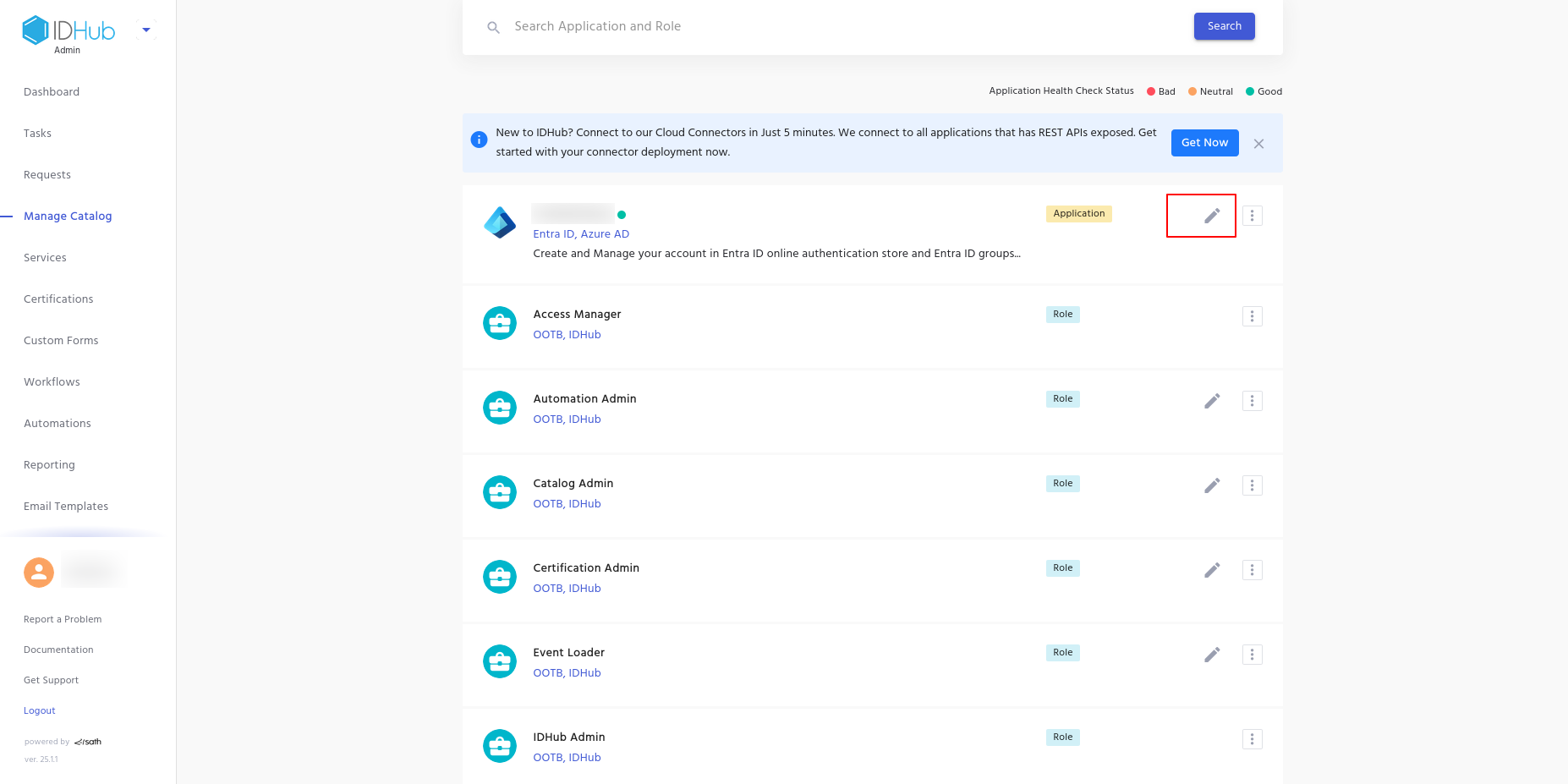 - Navigate to Manage Catalog in the IDHub Admin App and then click on the Edit icon for the Application.