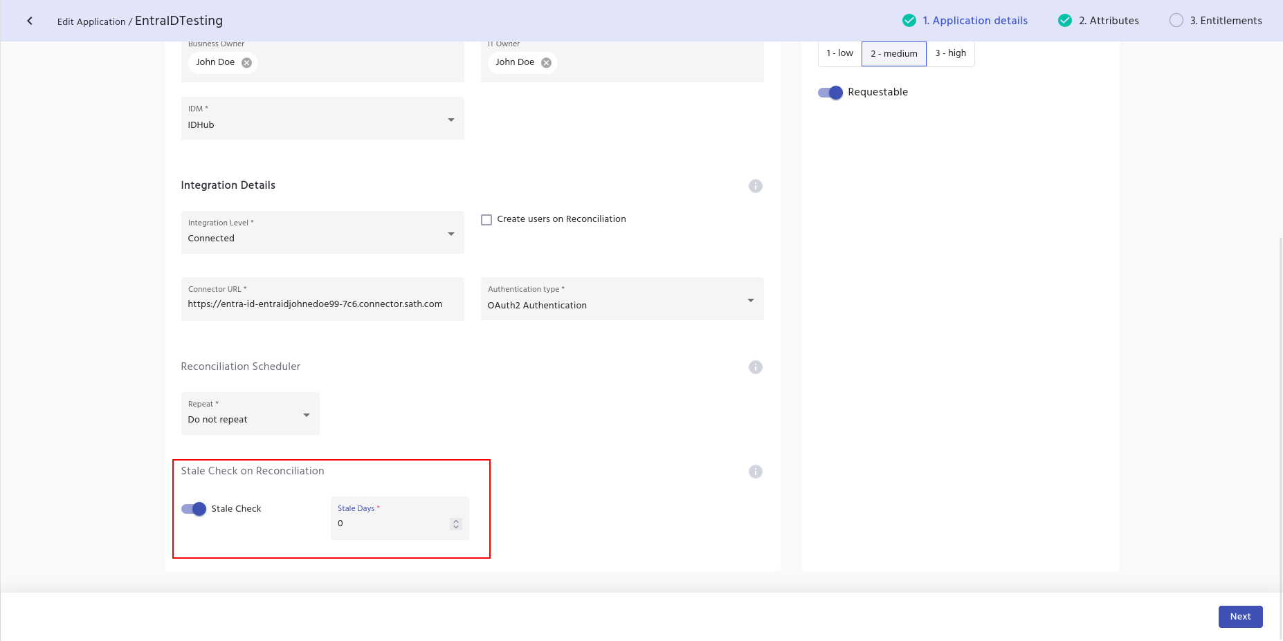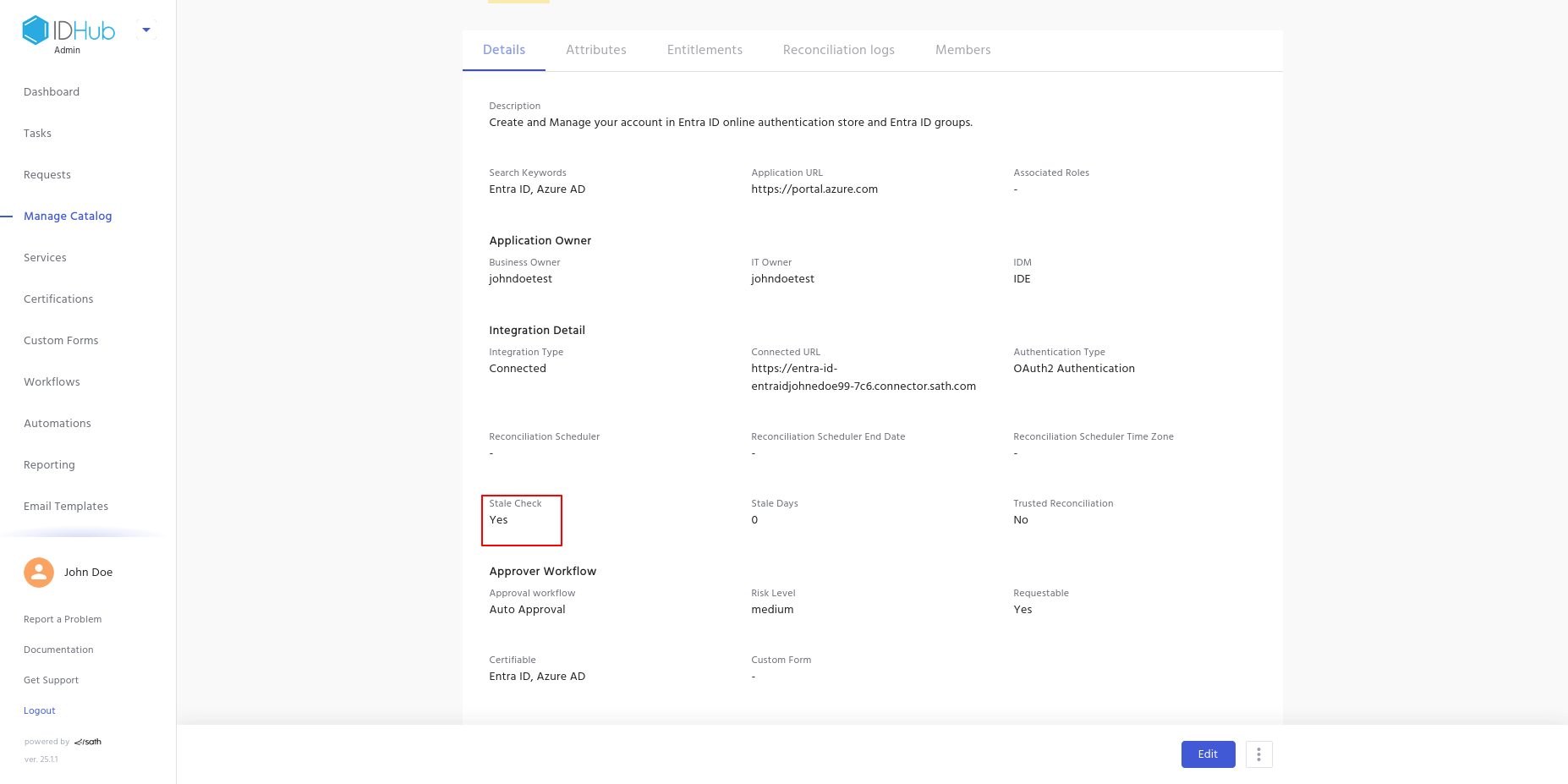 - Now, the Stale Check is enabled and is set to zero days, which means any accounts would be revoked from IDHub, if it is not present in the target system upon reconciliation of the application.