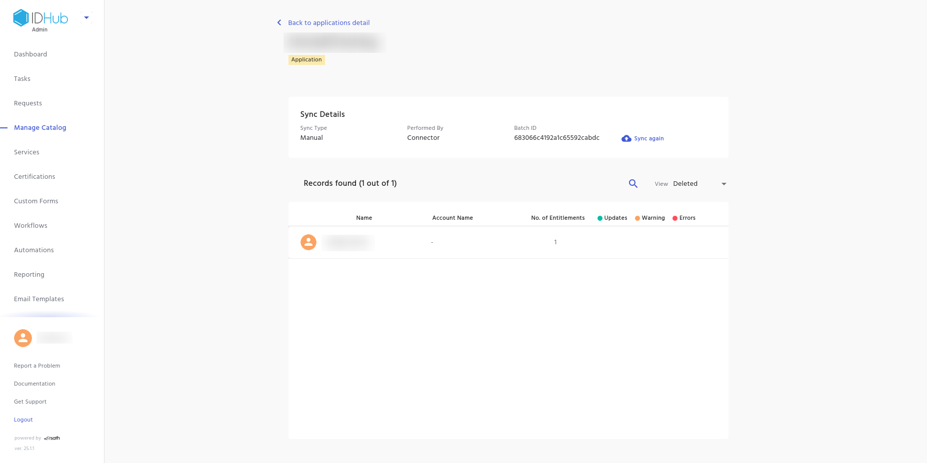 - Go back to Manage Catalog and then click on the application card and then click on the Reconciliation Logs tab.