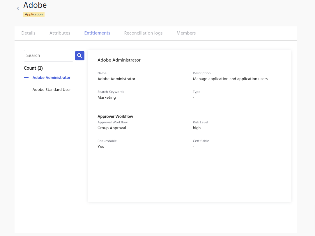 - This gives you the details of each entitlement such as Name, Description, Search Keyword, Approval Workflow