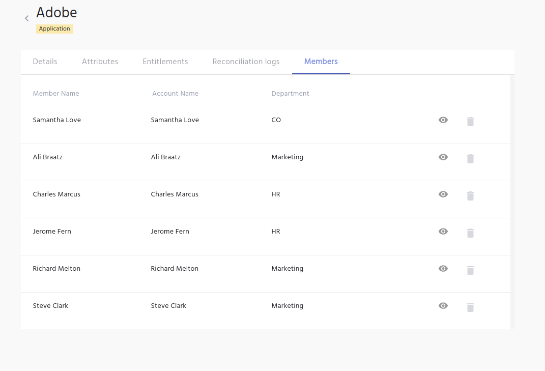 - The members tab of the application gives the list of users who have access to the application. User details such as member name, account name and department are shown.