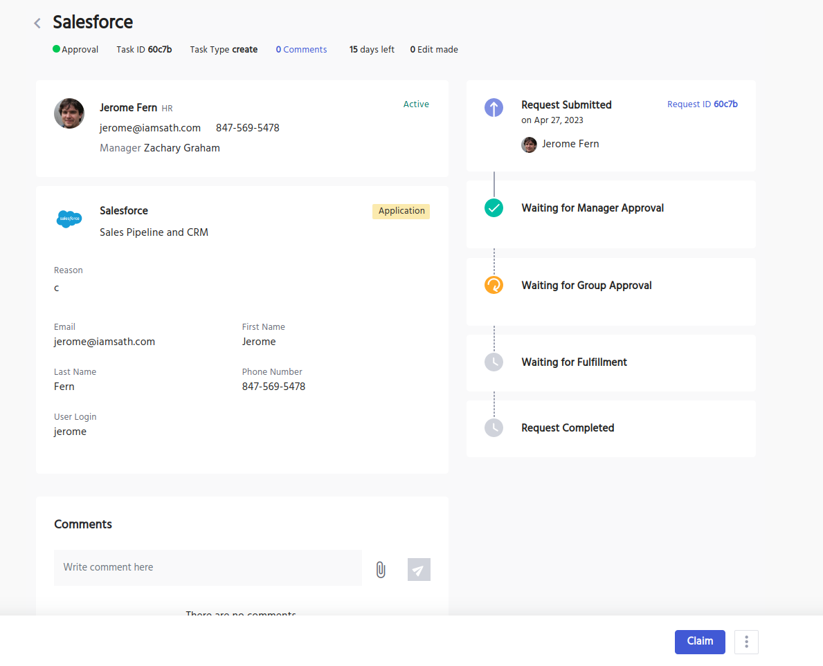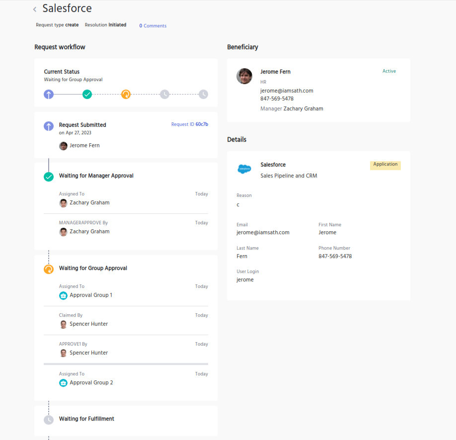 For Example: As can be seen in the screenshot below, the request is for the application SalesForce. Tasks had been generated for the request for the manager and the Approver Group 1 (Role). The manager has approved the task as well as one of the members of the Approve Group 1 role has approved the task. Now the request is waiting for fulfilment.