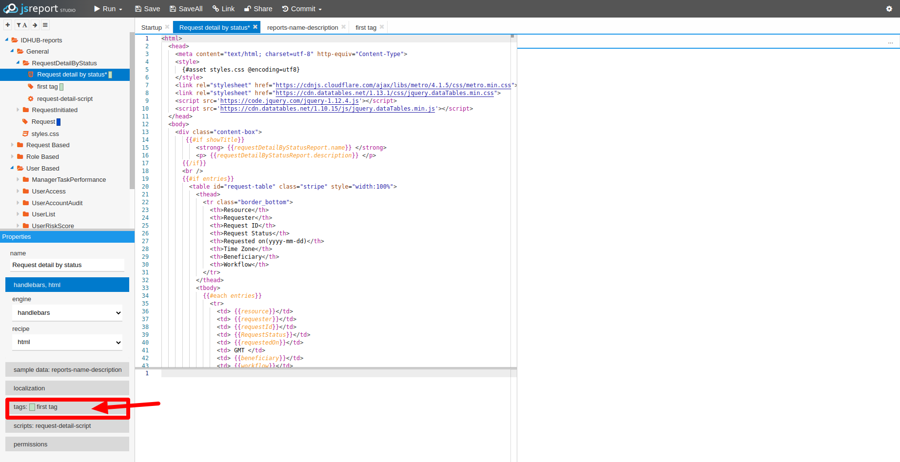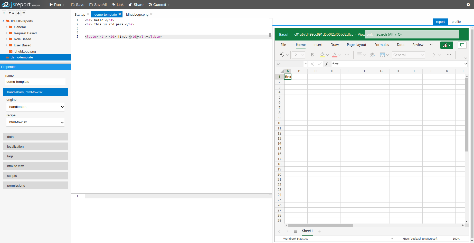 For Example: If you changed the recipe of the report to html to xslx, then clicked on the save button. And then click on the run button. JS report would show you the rendering in the right hand side as is shown in the screenshot below: