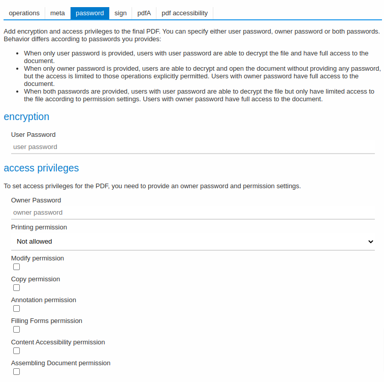 You can enter the user password and/or any permissions that you want to manage for the pdf.