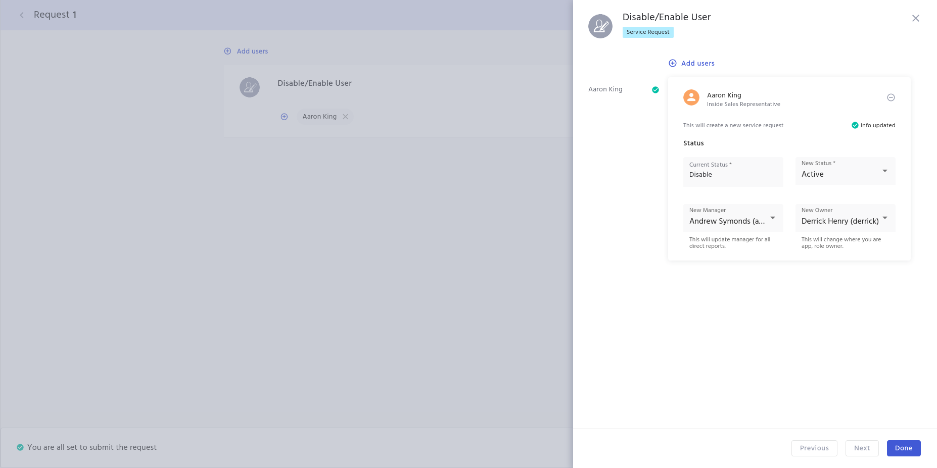 | Direct Report & Owner | The new manager will receive the updates and tasks for the enabled user. The owner of the enabled user will be updated with the new owner. |