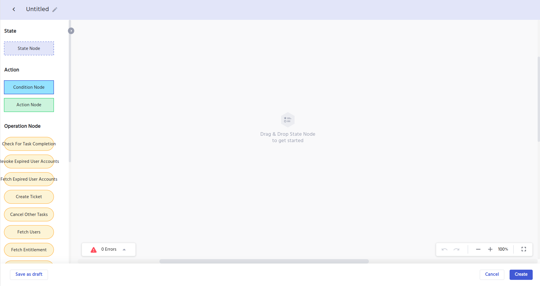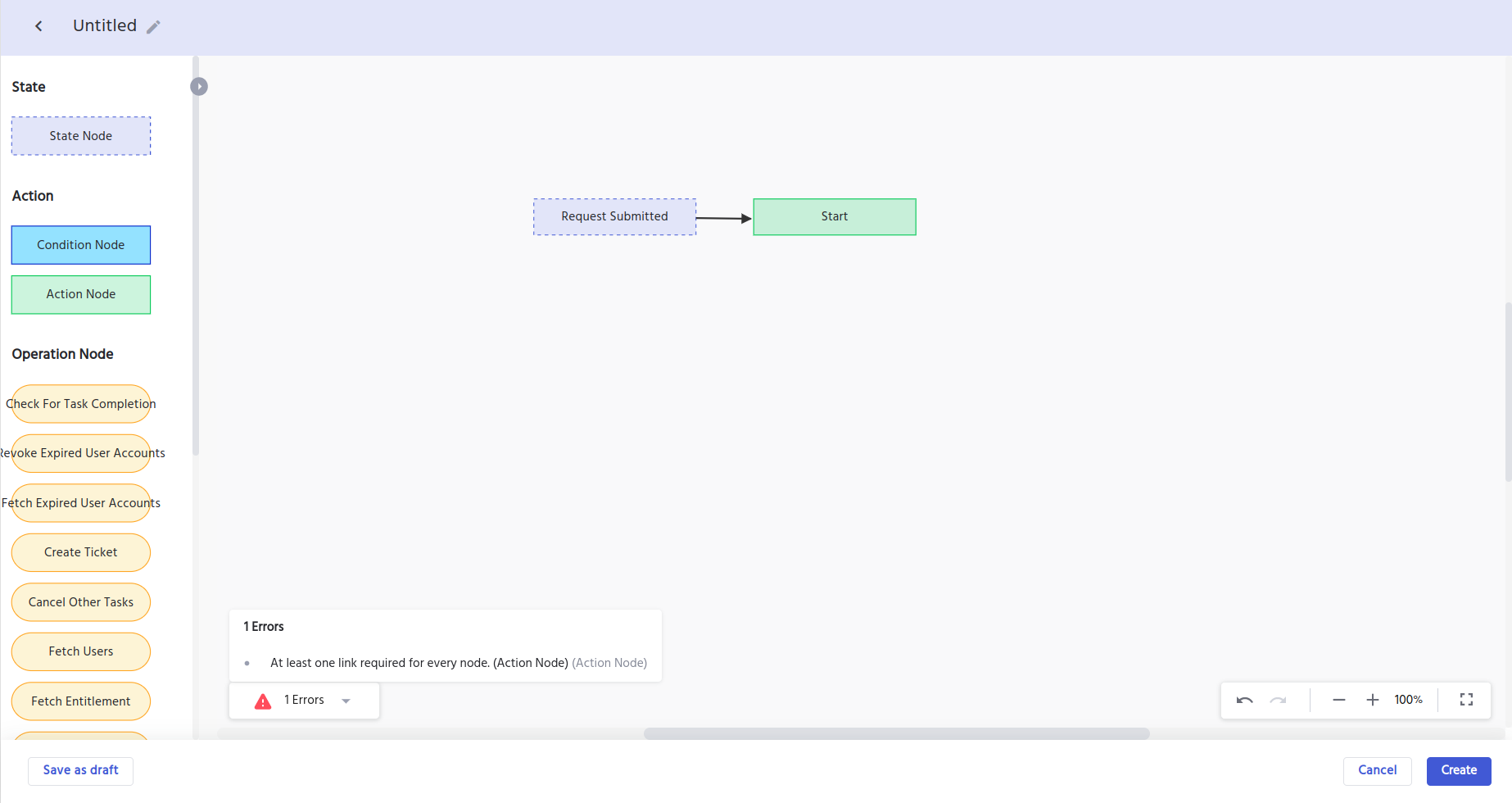 As you continue to build the workflow, errors in the workflow (if any) would show at the bottom left. Click on the errors button to see the list of errors and resolve it accordingly.