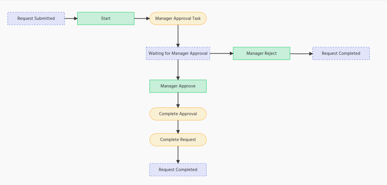 - Now the request is waiting for the Manager to take action on the task generated. Waiting For approval state node is put here to denote the state of the request.